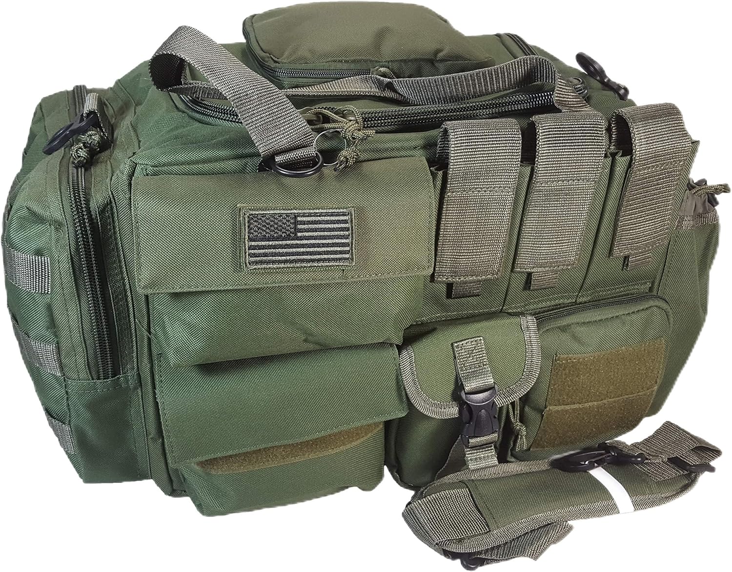 PRODUCT DETAILS Capacity: 2800 cu. in. Dimensions & weight: 20”(Width) x 13”(Height) x 11”(Depth) 3 lbs empty (Approximated weight) Compartments & Pockets: 1 Main compartment padded pockets inside ( 1 padded separator included) 4 front pockets, including 2 pockets with Velcro (3 Magazine pockets available) Zippered top pocket 1 pocket with 3 MOLLE style straps, on the Left side 2 pockets and 1 water bottle holder, on the Right side Materials: Polyester with PVC water resistant lining, #10 Heavy-duty zipper Accessories & additional features: Heavy duty U-zipper for accessing main compartment Multiple MOLLE style straps - 3 rows on side pocket Removable Shoulder strap Other colors are available and please contact us to check its availability